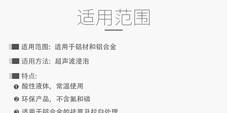 本品属于不含氟的酸性液体,适用于铝材和铝合金,特别是压铸铝的洗白、洗灰处理和铝合金的祛霉及拉白处理。